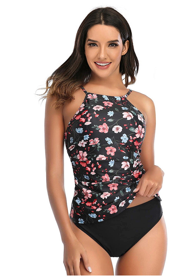 A felsőrész tank fazonú, magas dekoltázzsal és vékony pántokkal a stabil tartásért és a kényelmes viseletért. Puha betétekkel rendelkezik. A derékrészen kialakított drapírozott dizájn optikailag karcsúsít és kisimítja a sziluettet, a visszafogott virágminta pedig nőies hangsúlyt ad. Az alsórész letisztult, klasszikus fekete színű, kényelmes szabással és jó fedéssel.
